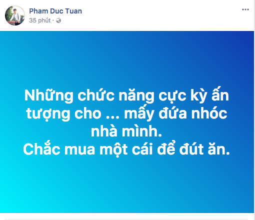Cách đó không lâu, ca sĩ Đức Tuấn cập nhật status mới được cho là liên quan tới các sản phẩm từ Apple trên trang cá nhân: “Những chức năng cực kỳ ấn tượng cho… mấy đứa nhóc nhà mình. Chắc mua một cái để đút ăn”.