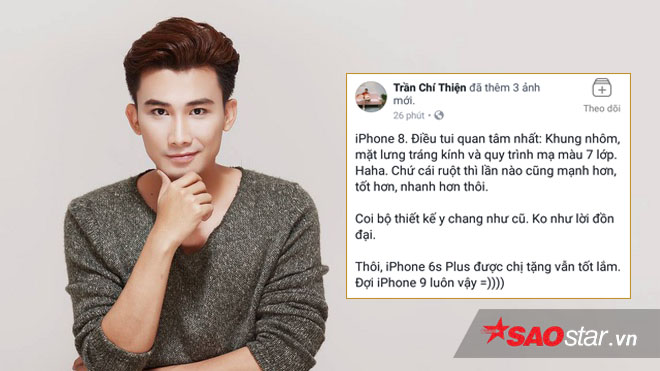 Không chỉ có Đức Tuấn, ca sĩ Chí Thiện cũng không mấy hài lòng về những thay đổi của iPhone. Anh viết: “Iphone 8, điều tui quan tâm nhất: khung nhôm, mặt lưng tráng kính và quy trình mạ màu 7 lớp. Chứ cái ruột thì lần nào cũng mạnh hơn, tốt hơn, nhanh hơn thôi. Coi bộ thiết kế y chang như cũ, không như lời đồn đại. Thôi, Iphone 6s Plus được chị tặng vẫn tốt lắm. Đợi Iphone 9 vậy”.