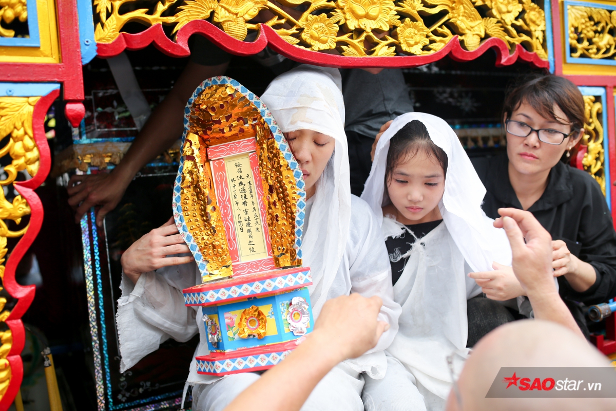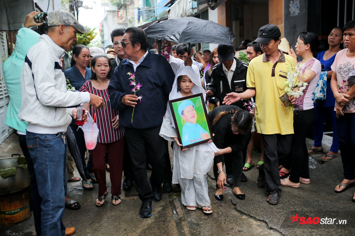 Con nuôi của nghệ sĩ Khánh Nam - bé Khánh Nhi bần thần ôm di ảnh bố.