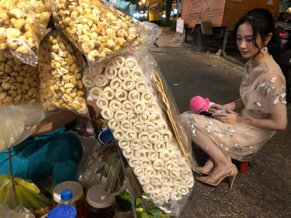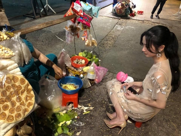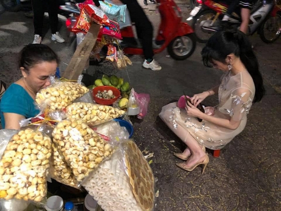 Nữ diễn viên đột nhiên “quên mình là ai” và ngay lập tức sà vào hàng bánh tráng trộn. Cô không ngại khi đang diện váy áo xinh đẹp chỉn chu ngồi vỉa hè mua bánh tráng trộn.