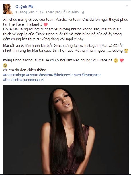 Mới đây, Mai Ngô, Á quân The Face Việt Nam cũng đã có những chia sẻ chúc mừng cho Grace. Đặc biệt hơn, Mai Ngô còn cho biết thêm Grace từng nhấn nút theo dõi Instagram của Mai và ủng hộ cô trong cuộc thi The Face Việt Nam năm ngoái. Điều này khiến cô rất vui và cảm thấy hân hạnh. Đây thực sự là một bất ngờ thú vị vì trước đó trong cuộc trò chuyện với Quán quân Phí Phương Anh, Grace cũng đã tiết lộ rằng cô từng xem The Face phiên bản Việt và rất yêu thích chương trình.