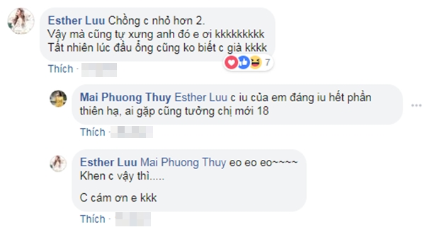 Trước dòng trạng thái “mặn mà” của “đàn em”, Hari Won liền “tố” Trấn Thành liền tay: “Chồng chị nhỏ hơn 2 tuổi vậy mà cũng tự xưng anh đó em“. Tuy nhiên giọng hát Vì em vẫn chú thích thêm là do khi ấy nam MC chưa biết tuổi thật của cô. Đáp lại, Mai Phương Thúy cũng rất ngọt ngào dành lời khen cho Hari Won: “Chị iu của em đáng iu hết phần thiên hạ, ai gặp cũng tưởng chị mới 18“.