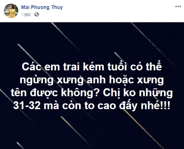 Vốn nổi tiếng là người hài hước với những đăng tải trên trang cá nhân, mới đây Hoa hậu Mai Phương Thúy lại tiếp tục khiến cư dân mạng bật cười nghiêng ngả cùng hành động “đánh tiếng” đến những người đàn ông ít tuổi hơn mình: “Các em trai kém tuổi có thể ngừng xưng anh hoặc xưng tên được không? Chị ko những 31-32 mà còn to cao đấy nhé!!!“.