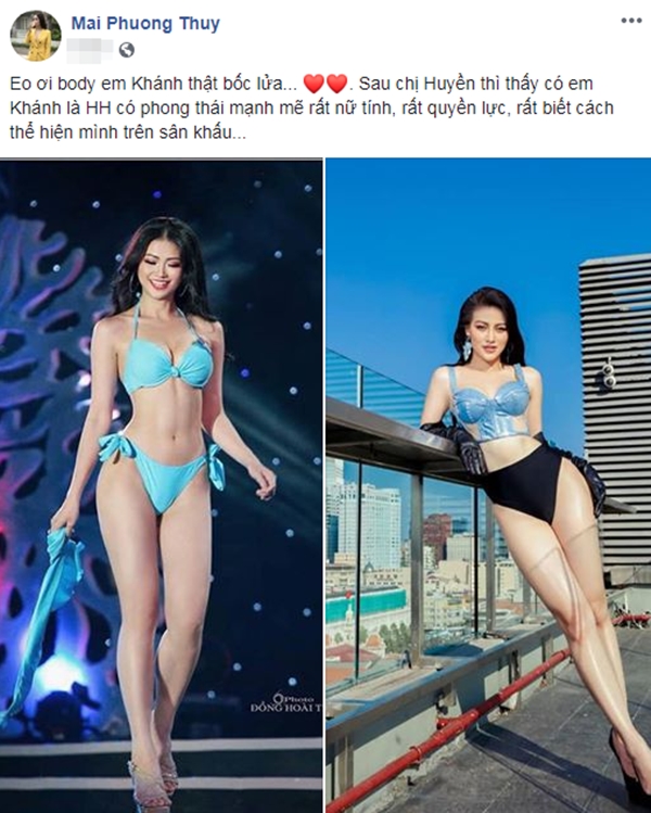 Vốn là người thân thiện và khéo léo, Mai Phương Thúy rất “được lòng” không chỉ khán giả mà còn bạn bè đồng nghiệp. Trước khi khen Hari Won “trẻ đẹp như 18”, sáng nay nàng Hậu cũng dành những lời “có cánh cho Miss Earth 2018 Nguyễn Phương Khánh: “Eo ơi body em Khánh thật bốc lửa. Sau chị Huyền thì thấy có em Khánh là Hoa hậu có phong thái mạnh mẽ rất nữ tính, rất quyền lực, rất biết cách thể hiện mình trên sân khấu“.