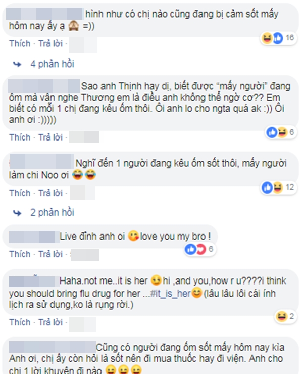 Mới đây, nam ca sĩ Noo Phước Thịnh khiến các fan bất ngờ khi tự chia sẻ video trình diễn ca khúc Thương anh là điều anh không thể ngờ với dòng tâm sự chân thành. Quán quân Hòa âm ánh sáng mùa 2 viết: “Lúc hát bài này, tự dưng lại nghĩ đến mấy người đang cảm sốt nằm một chỗ ở nhà“. Trùng hợp, hoa hậu Mai Phương Thúy cũng đang khiến các fan lo lắng khi chia sẻ đang mắc bệnh và chỉ “nằm tại nhà”.