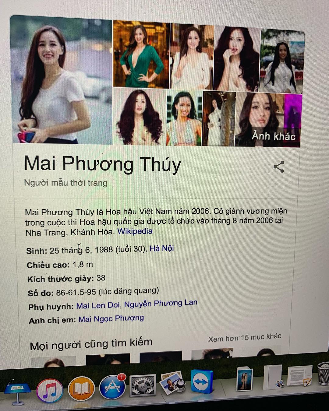 Ngay lập tức, Mai Phương Thuý “nhờ vả” mọi người sửa hộ thông tin trên wiki rằng… cô đang bị nhầm lẫn. Ngày sinh của Mai Phương Thuý là 6/8/1988 và bố của người đẹp tên là Mai Xuân Quang chứ không phải Mai Len Doi như thông tin hiện tại.