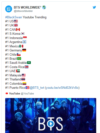 BTS xuất hiện trong The Late Late Show của James Corden và lần đầu tiên trình diễn ca khúc mới, “Black Swan” của mình trên sân khấu. Màn biểu diễn này đã vượt 10.000.000 lượt xem trên Youtube chỉ trong một ngày.