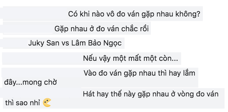 Bên cạnh đó, cũng có không ít những giả thiết được đưa ra từ fan liệu rằng với giọng ca xuất sắc thế này Juky San và Lâm Bảo Ngọc có gặp nhau ở vòng “Đo Ván” hay không?: “Hát hay thế này gặp nhau ở vòng đo ván thì sao nhỉ?; Gặp nhau ở đo ván chắc rồi; Có khi nào vô đo ván gặp nhau không?; Vào đo ván gặp nhau thì hay lắm đây,…v.v.”