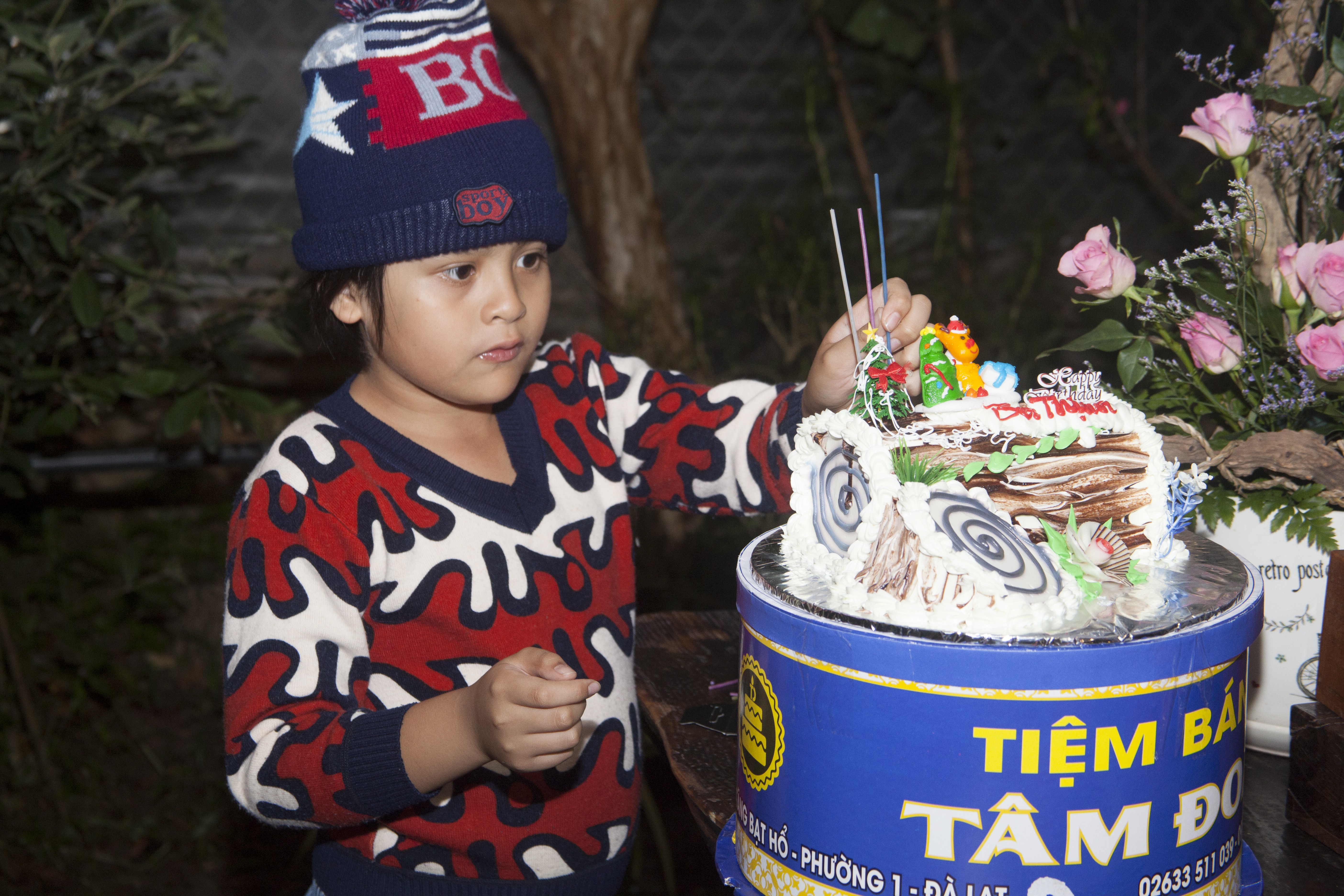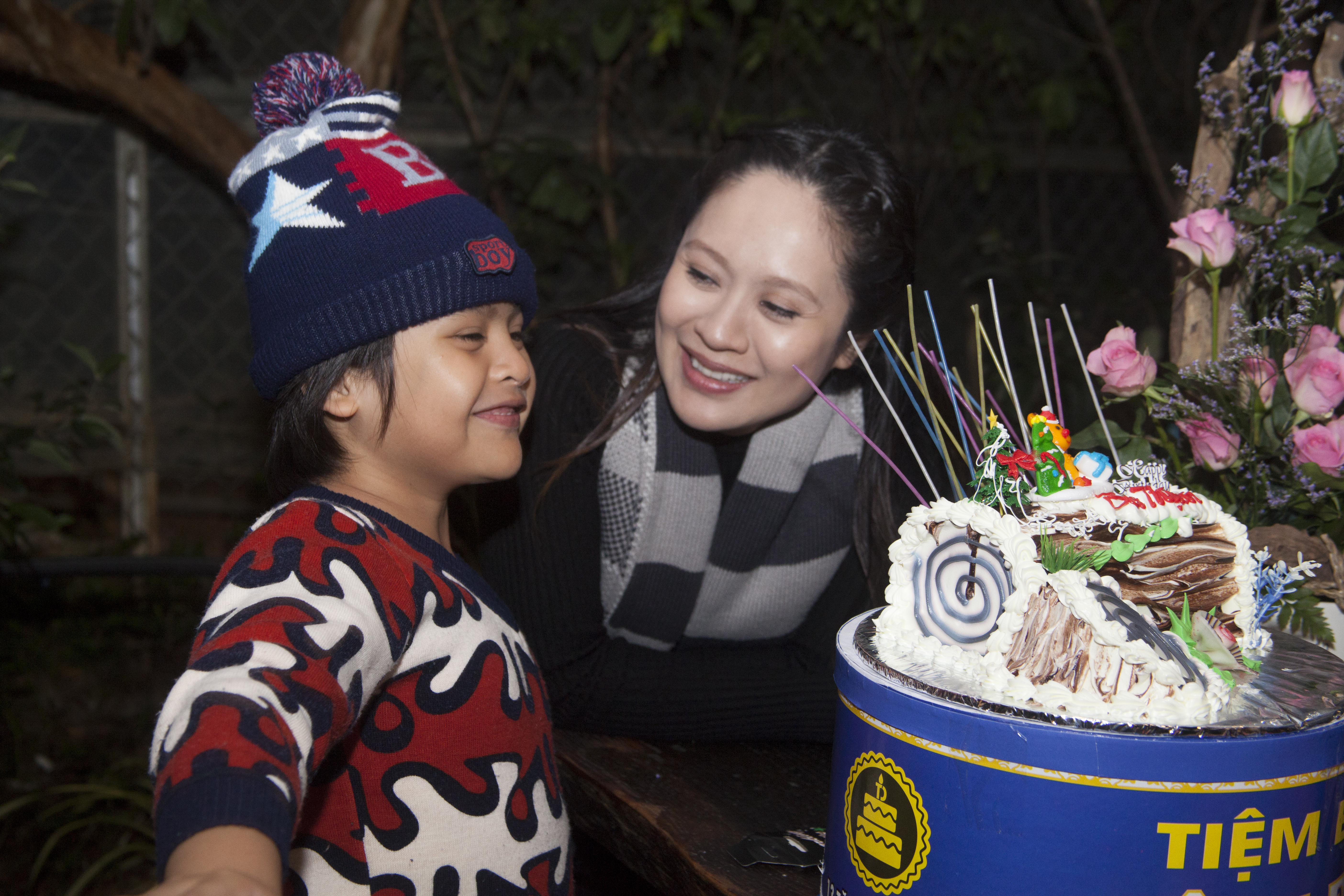 Hai mẹ con rất vui vẻ khi trang trí bánh kem cho ba Đức Thịnh.