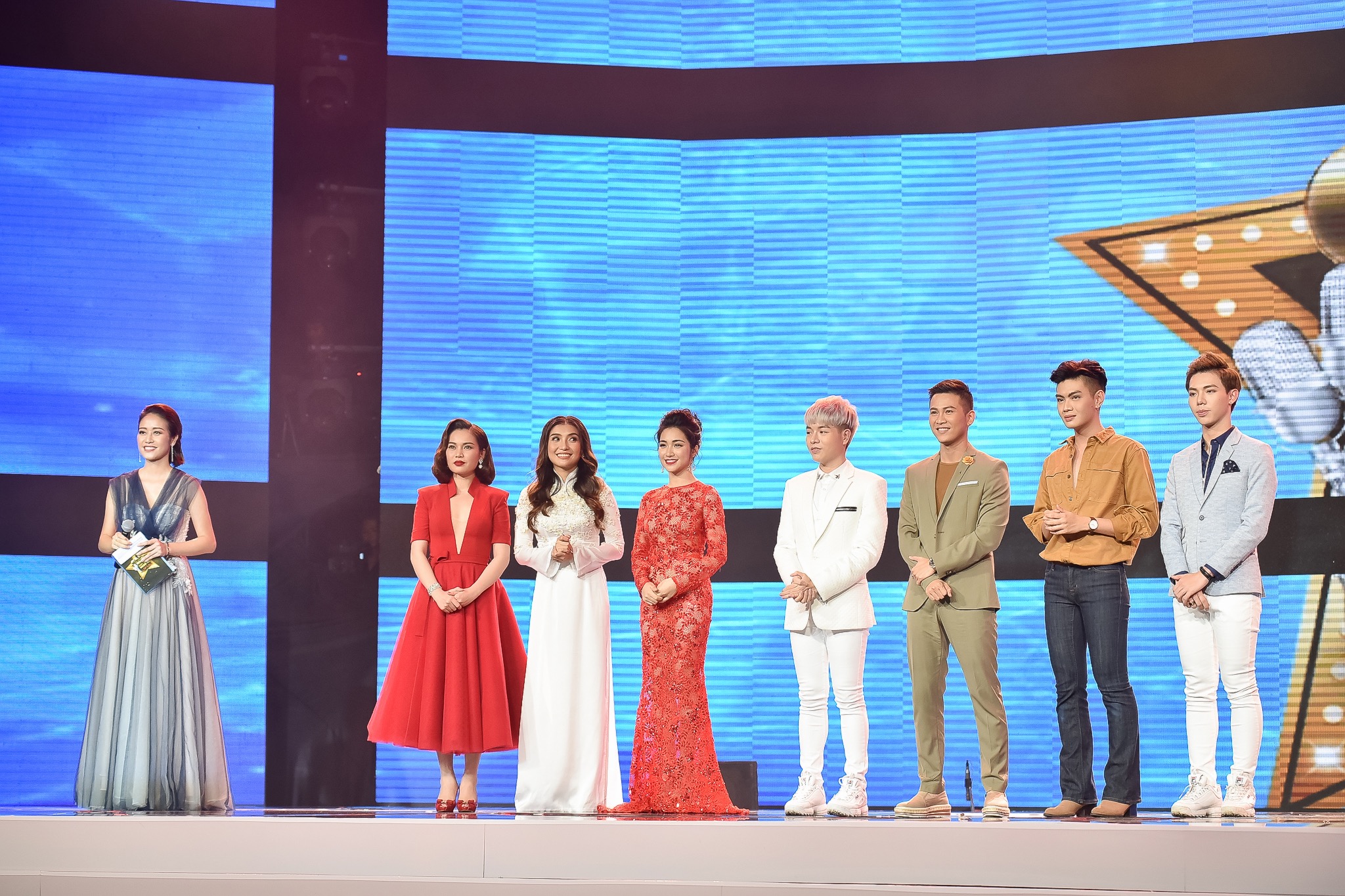 Phí Linh bên cạnh 7 thí sinh của chương trình.