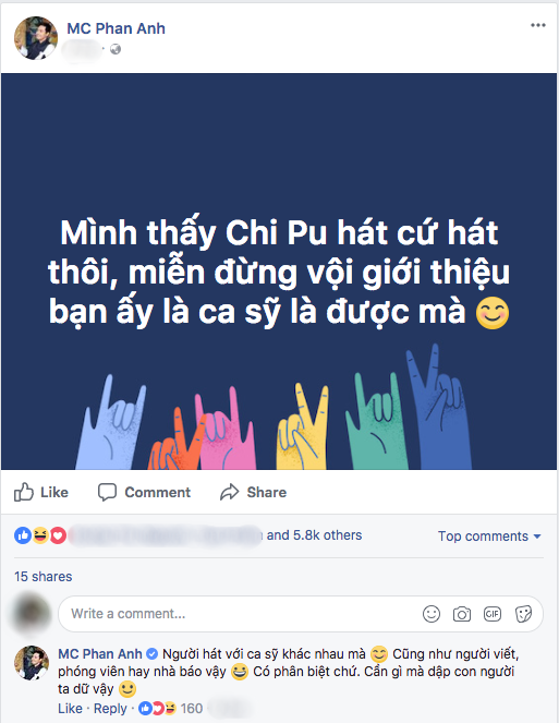 Không nằm ngoài cuộc, MC Phan Anh lên tiếng về vụ việc của Chi Pu. Anh thẳng thắn chia sẻ quan điểm: “Chi Pu hát cứ hát thôi, miễn đừng vội giới thiệu bạn ấy là ca sĩ vội là được mà. Cần gì mà dập con người ta dữ vậy?”.