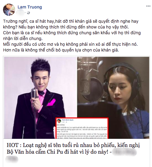 Về phần Lam Trường, anh cũng chia sẻ bài báo có nội dung nghệ sĩ Việt rủ nhau bỏ phiếu, kiến nghị Bộ Văn hoá Thể thao và Du lịch cấm Chi Pu đi hát kèm dòng chú thích: “Trường nghĩ, ca sĩ hát hay, hát dở thì khán giả sẽ quyết định nghe hay không? Nếu bạn không thích thì đừng đến show của họ vậy thôi”. Giọng ca Katy Katy cho rằng mỗi người đều có ước mơ và họ không phải xin xỏ ai để thực hiện nó, hơn nữa không thể chối bỏ quyền lựa chọn của khán giả.