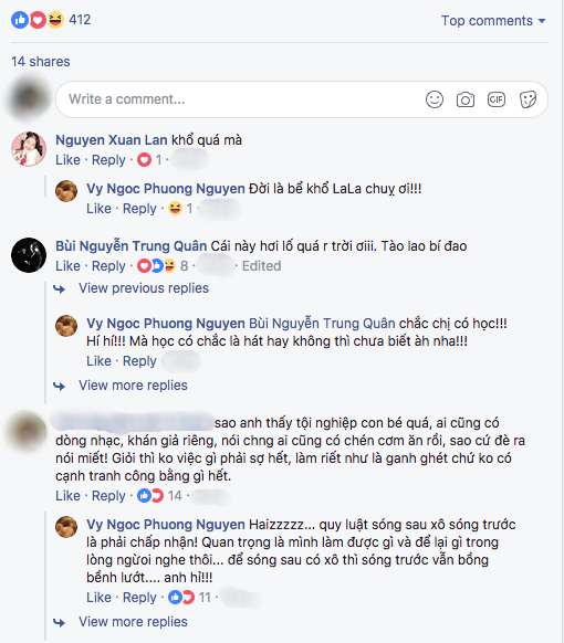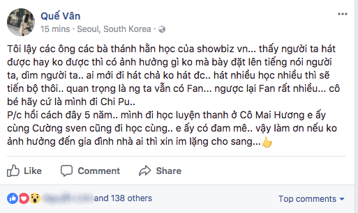 P/S: Hồi cách đây 5 năm, mình đi học luyện thanh ở Cô Mai Hương. Em ấy cùng Cường Seven cũng đi học cùng. Em ấy có đam mê, vậy làm ơn nếu không ảnh hưởng đến gia đình nhà ai thì xin im lặng cho sang”.