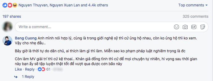 Phía dưới bài đăng, Bằng Cường ủng hộ nhận định này. Anh viết: “Anh mình nói hợp lý, cùng là trong giới nghệ sĩ thì cứ ủng hộ nhau, còn không ủng hộ thì không xem. Vậy cho nhẹ đầu! Bây giờ là thời tự do dân chủ, ai thích làm gì thì làm. Miễn sao không phạm pháp luật nghiêm trọng là được.