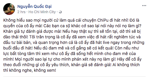 Bức xúc trước ý kiến muốn bỏ phiếu cấm Chi Pu đi hát, ca sĩ Quốc Đại không ngần ngại đăng bài viết bênh vực người đẹp sinh năm 1993. Anh cho rằng hát hay không là quyền của Chi Pu, khán giả sẽ đánh giá chất lượng, hay thì tồn tại còn dở sẽ bị đào thải.