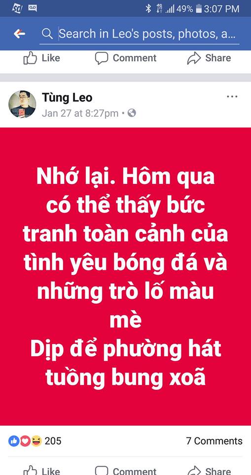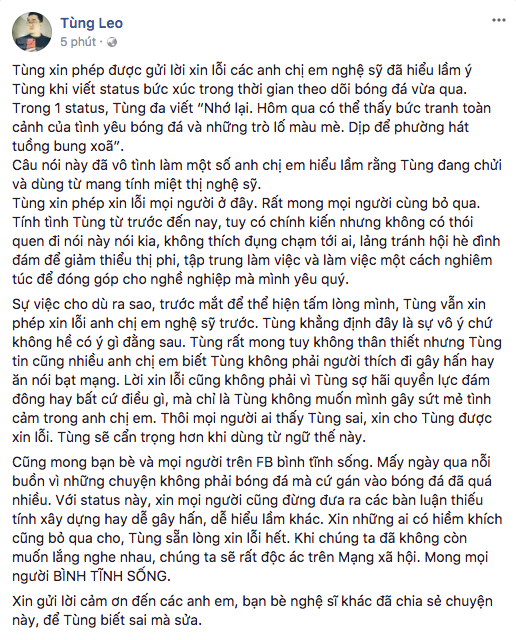 Mới đây, thông qua trang Facebook cá nhân, Tùng Leo chính thức lên tiếng xin lỗi vì làm nhiều nghệ sĩ hiểu lầm ý khi họ đọc được dòng trạng thái bức xúc trong thời gian theo dõi bóng đá của anh.