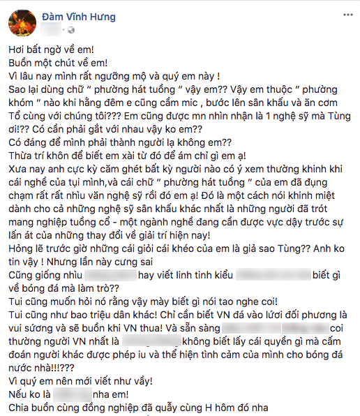 “Ông hoàng nhạc Việt” phật lòng viết: “Hơi bất ngờ về em! Buồn một chút về em! Vì lâu nay mình rất ngưỡng mộ và quý em này. Sao lại dùng chữ 'phường hát tuồng' vậy em? Vậy em thuộc 'phường khóm' nào khi hằng đêm em cũng cầm mic, bước lên sân khấu và ăn cơm Tổ cùng với chúng tôi?