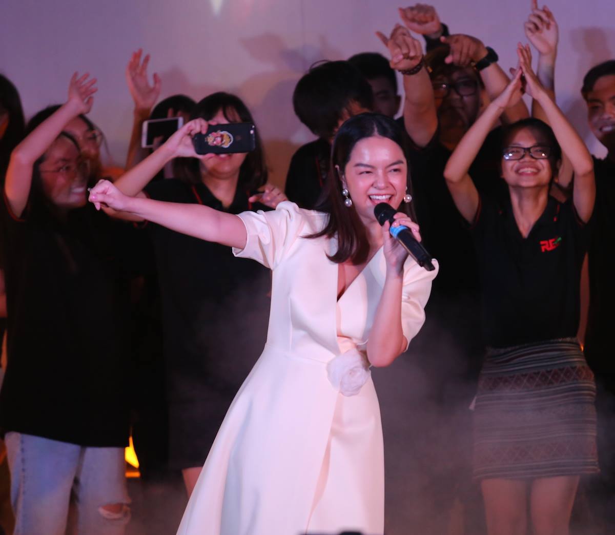 Cô trang điểm nhẹ nhàng và để tóc xõa thẳng chải ốp vào đầu. Quỳnh Anh làm nóng khán phòng với vẻ đẹp tươi mới mặn mà và cách trình diễn chuyên nghiệp da diết đi vào lòng người.