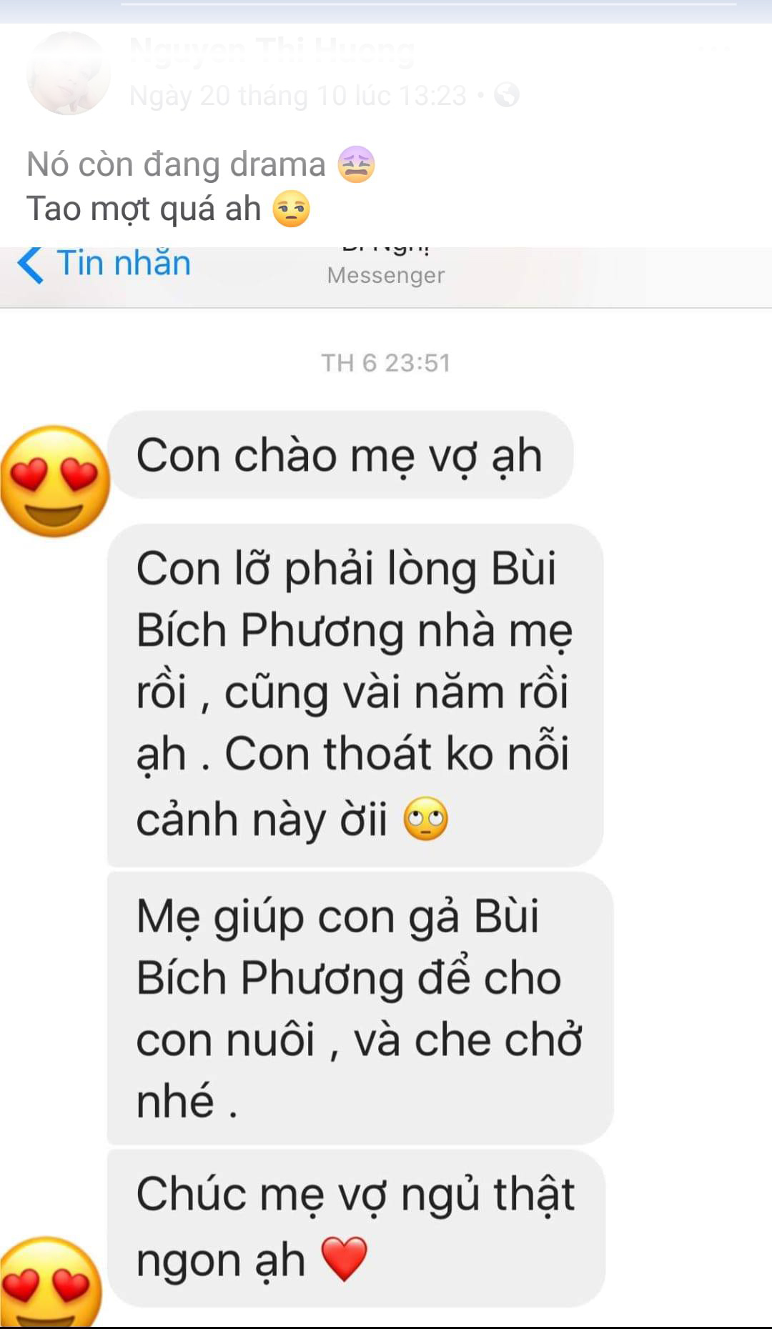 Dòng tin nhắn 'tỏ lòng yêu thương' mạnh mẽ, dứt khoát của chàng rể 'không tên': “Con chào mẹ vợ ạ! Con lỡ phải lòng Bùi Bích Phương nhà mẹ rồi, cũng vài năm rồi ạ. Con thoát không nổi cảnh này ời… Mẹ giúp con gả Bùi Bích Phương cho con nuôi, và che chở nhé. Chúc mẹ vợ ngủ thật ngon ạ!”. Lời nhắn hết sức lịch sự và có vẻ 'ngoan' của chàng con rể 'trên trời' khiến mẹ nữ ngôi sao bình luận hài hước: “Mệt mỏi quá mà!”.