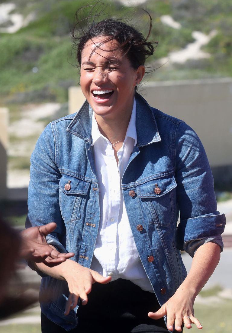 Hôm nay, Meghan đã đến thăm bãi biển Monwabisi. Công nương xuất hiện giản dị với áo sơ mi trắng, áo khoác jean màu xanh, quần đen và đeo túi chéo màu oliu của hãng Madewell. Nếu zoom kỹ vào ngón áp út, bạn sẽ nhận thấy chiếc nhẫn cưới khổng lồ của cô ấy đã được thay thế bằng một chiếc nhẫn màu ngọc lam tinh tế từ Jennifer Meyer.
