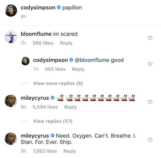 Bình luận trên Instagram của Cody như sau: “Đôi tay hư hỏng của Miley kìa”, “Cái gì thế này”, “Trên Wattpad chắc chắn phải có bộ truyện tự sáng tác 'Cody và Miley: Khi gái hư gặp trai tốt' nhỉ”, “Mắt của tôiiii”,…