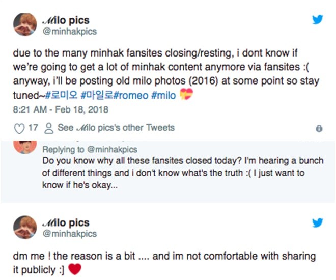 Các fan của nam thần tượng 22 tuổi muốn quay lưng lại với Milo, họ đã mất niềm tin vào anh ngay khi chàng trai này còn chưa mấy nổi tiếng. Milo tên thật Kim Min Hak, là rapper và dancer chính của nhóm nhạc nam Romeo gồm 7 thành viên. Nhóm ra mắt vào năm 2015 nhưng không đạt thành tích nào nổi bật.