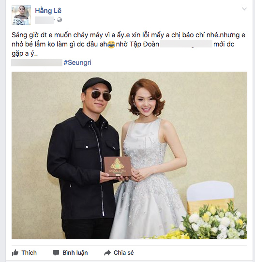 Mới đây, trên Facebook cá nhân của mình, Minh Hằng không giấu nổi niềm vui khi được gặp Seungri. Không chỉ khoe bức ảnh chụp cùng thần tượng Hàn Quốc nhận chìa khóa căn hộ 1 triệu USD mà Minh Hằng còn tiết lộ ngày hôm nay cô bị gọi điện thoại đến “cháy máy” vì Seungri. “Sáng giờ điện thoại em muốn cháy máy vì anh ấy. Em xin lỗi mấy anh chị báo chí nhé nhưng em nhỏ bé lắm không làm gì được đâu ạ” - Minh Hằng viết.