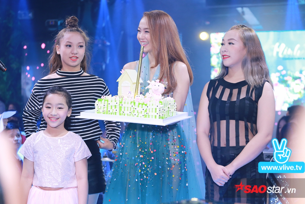 17h15: Minh Hằng xuất hiện trong bộ váy xanh, lộng lẫy như một nàng công chúa. Nữ ca sĩ gửi lời cảm ơn đến người hâm mộ, dù thời tiết khá xấu nhưng các bạn vẫn cố gắng có mặt để chúc mừng sinh nhật của mình.