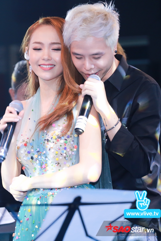 Minh Hằng và “bạn thân” Trịnh Thăng Bình tiếp tục khiến không gian buổi offline thêm phần lãng mạn khi cùng song ca ca khúc Một thời đã xa. Trong lúc biểu diễn, nữ ca sĩ Sắc môi em hồng còn nhẹ nhàng tựa vào lòng của Trịnh Thăng Bình khiến khán giả hò reo phấn khích.