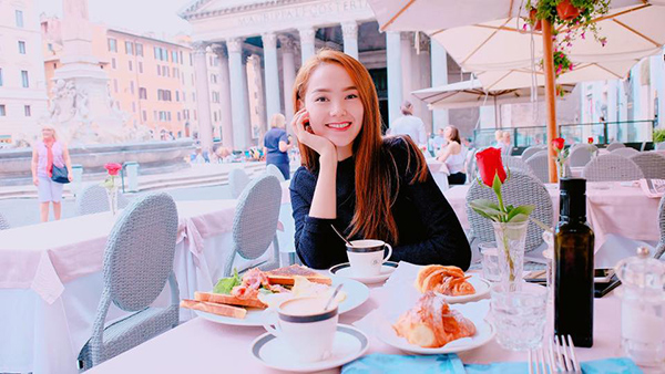 Vừa đáp xuống sân bay, Minh Hằng đã tới quảng trường Piazza di Sant'Eustachio thưởng thức 1 cốc cappuccino, ăn cùng 1 dĩa bacon egg tráng miệng và ngắm đền Patheon giữa thời tiết mát mẻ dịu nhẹ của mùa hè Châu Âu.