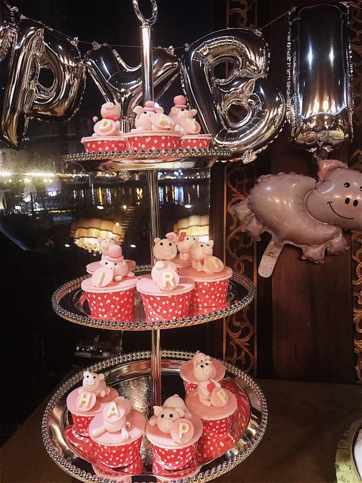 Không gian ngập tràn bánh kem hình con heo và nến.