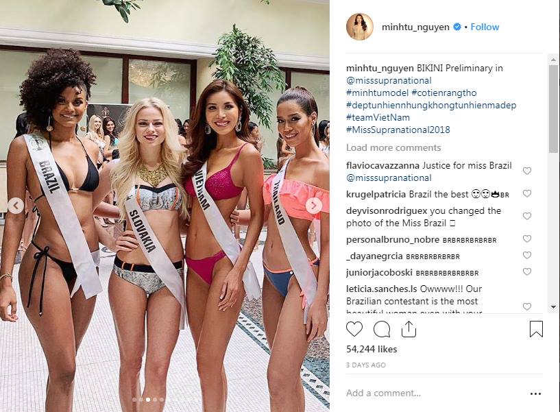 Mới đây, trên Instag cá nhân Minh Tú lại không may khi rơi vào tầm ngắm của fan Brazil khi đại diện quốc gia này xuất hiện cùng Minh Tú trong một khung hình. Điều đáng chú ý khiến Minh Tú bị “cáo buộc” là chơi xấu xuất phát từ một vài chi tiết lạ trên bức hình được cho là photoshop: Làm xấu đi body của Miss Brazil.