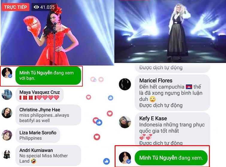 Theo dõi màn trình diễn của đại diện Việt Nam - Bùi Phương Nga, fan Việt thích thú khi phát hiện ra cả Minh Tú - đại diện của Việt Nam tại Hoa hậu Siêu quốc gia năm nay cũng đang xem trực tiếp phần thi đầy màu sắc của Hoa hậu Hòa bình Quốc tế.