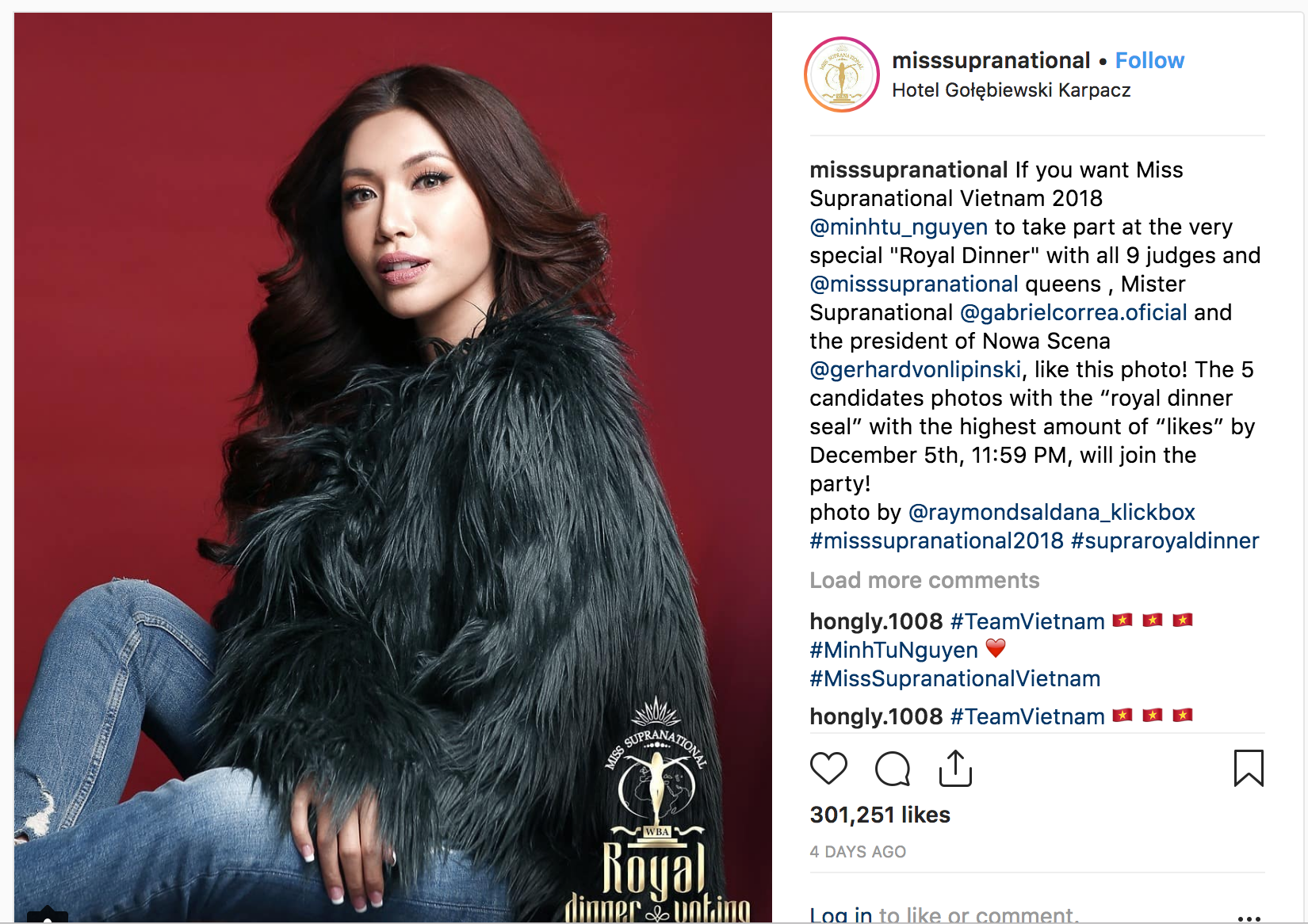 Thừa thắng xông lên ở vị trí thứ 2 lượt bình chọn cùng 9 người đẹp khác tham gia Royal Party thân mật với BTC thì đại diện Việt Nam đã vượt mặt Indonesia để dẫn đầu. Với cú hit “lội ngược dòng” này sẽ giúp Minh Tú đứng gần hơn với danh hiệu “Người đẹp truyền thông” đồng thời cũng sẽ có cơ hội cao hơn để chạm đến vương miện Miss Supranational 2018.