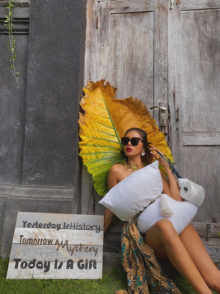 Siêu mẫu chia sẻ rằng “Nay sắm sửa bộ đồ để đi dự Met Gala với mấy má trong xóm (ý nói mấy bà cây cỏ, cóc nhái, ruồi muỗi trong vườn nhà tôi). Ta nói cây nhà lá vườn nha mọi người ơi. Mấy bà Xuân Hạ Thu Đông gãy ngang hết với tui”. Hoa hậu còn nói rằng, thấy người khác tham gia trào lưu #Pillowchallenge đẹp quá nên cô cũng quyết tâm bắt trend.