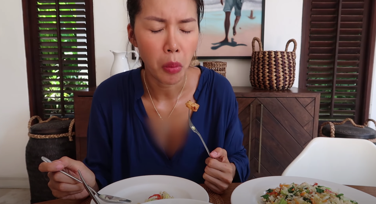 Ngoài “Cà Ri Gà”, cả hai còn nấu thêm cơm chiên, một món ăn quá quen thuộc nhưng với Minh Tú khi ăn thì có mùi vị khá “phức tạp”. Và sau những phút đứng quay và nói chuyện “xàm” để tăng không phí bếp núc, thì các món ăn đã được nấu chín và nhiệm vụ của nàng dâu Minh Tú là ngồi thưởng thức và review lại cho khán giả nghe. Với một người nấu ăn hơi tệ nhưng ăn thì siêu giỏi, Minh Tú đã dành những lời khen cho các món ăn mình phụ nấu, và biết đâu khi về Việt Nam cô nàng sẽ nấu cho gia đình của mình thưởng thức.