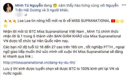 Theo đó, cựu HLV The Look hào hứng chia sẻ: “Loa loa, tin nóng hổi mới ra lò về Miss Supranational Vietnam. Nhận lời mời từ BTC Miss Supranational Việt Nam , Minh Tú chính thức nhận lời là 1 trong 5 thành viên BAN GIÁM KHẢO của Miss Supranational VN được tổ chức tại Hàn Quốc năm nay”.