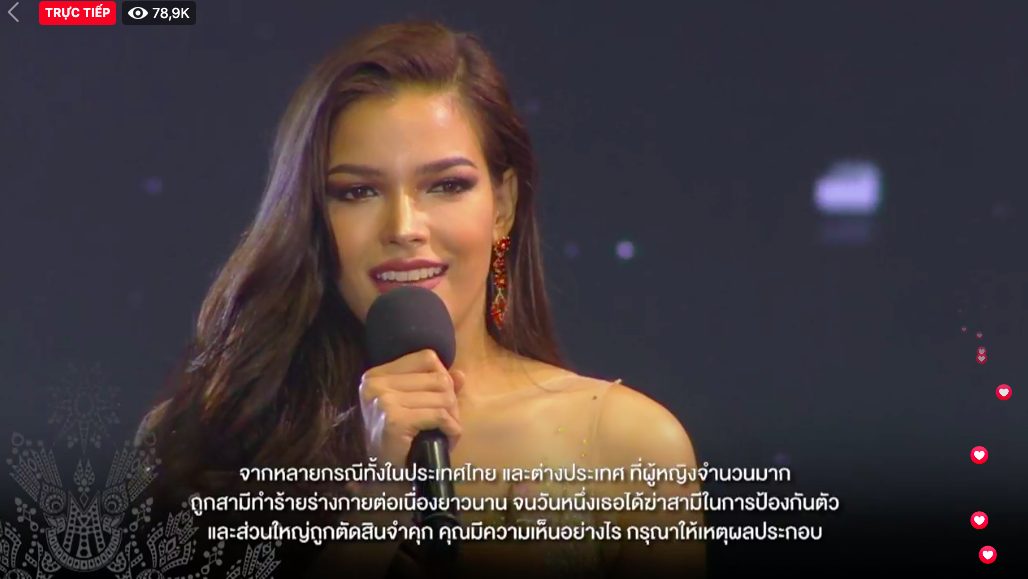 Tại phần thi ứng xử, bằng lí lẽ sắc bén và nền tảng kiến thức vững chắc cùng với phong thái trả lời tự tin, người đẹp Paweensuda Drouin đã nhận được nhiều sự đồng thuận của các fan theo dõi cuộc thi và BGK. Từ nhỏ đã sống ở Canada nên vốn tiếng Anh của cô nàng vô cùng nhuần nhuyễn. Trong cả hai phần thi ứng xử, Tân Hoa hậu đều trả lời bằng Anh ngữ lưu loát.