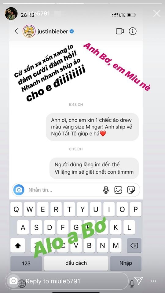 Miu Lê mạnh dạn xin áo và nhờ Justin Bieber gửi hàng về tận nhà.