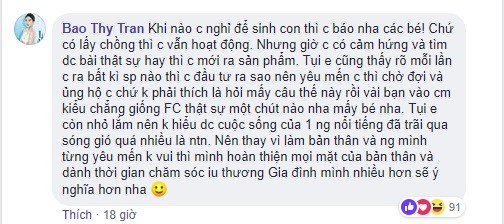 Trước đó Bảo Thy cũng gặp phải một tình huống “ngặt nghèo” khác khi nhận được câu hỏi “còn đi hát không?” từ cư dân mạng. Trước câu hỏi “không mấy thiện chí” này, nữ ca sĩ đã nhanh chóng đáp trả. Theo đó, Bảo Thy cho biết cho dù có lấy chồng sinh con thì cô vẫn hoạt động nghệ thuật. Ngoài ra, nữ ca sĩ chia sẻ mỗi lần ra sản phẩm âm nhạc đều vô cùng đầu tư, chăm chút nên phải tìm được cảm hứng và bài hay thật sự thì cô mới chính thức trình làng. Bảo Thy không quên trả lời khá “cứng” khi dặn fan của mình rằng thay vì làm người mình từng yêu mến không vui thì nên hoàn thiện bản thân mình và yêu thương chăm sóc gia đình nhiều hơn.