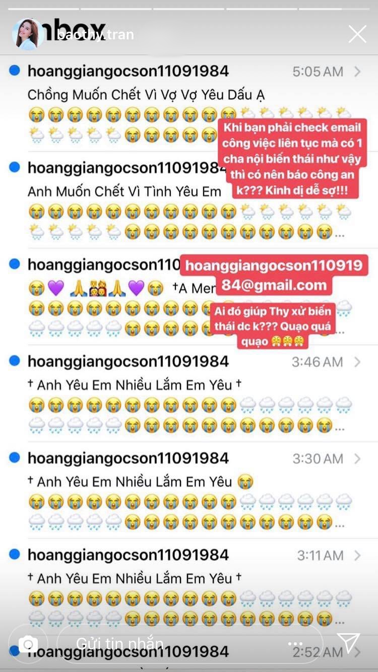 Mới đây, Bảo Thy bất ngờ “cầu cứu” cư dân mạng khi bị một fan cuồng “tấn công” lien tiếp vào hộp mail cá nhân. Theo như thời gian hiển thị có thể thấy nhân vật này không kể ngày đêm vẫn quyết liệt tỏ tình với cô. Bảo Thy bất lực: “Khi bạn phải check email công việc liên tục mà có 1 cha nội biến thái như vậy thì có nên báo công an không? Kinh dị dễ sợ!!“. Nghệ sĩ nhận được tình cảm từ khán giả là một hạnh phúc, tuy nhiên trường hợp này thì ai cũng phải “xách dép chạy dài” thôi!