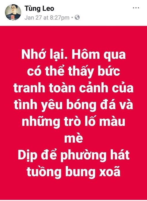 Mới đây, trên trang cá nhân, Đàm Vĩnh Hưng bất ngờ đăng tải ảnh chụp màn hình bài viết của MC Tùng Leo về các hoạt động vinh danh U23 Việt Nam hôm qua. Cụ thể, dòng trạng thái có nội dung như sau: “Nhớ lại! Hôm qua có thể thấy bức tranh toàn cảnh của tình yêu bóng đá và những trò lố màu mè. Dịp để phường hát tuồng bung xoã”.