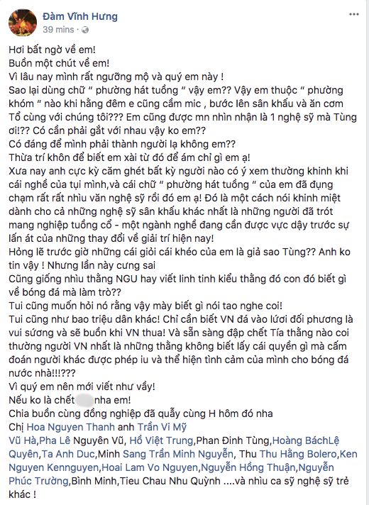 Vậy em thuộc ‘phường nhóm’ nào khi hằng đêm em cũng cầm mic, bước lên sân khấu và ăn cơm Tổ cùng với chúng tôi? Em cũng được mọi người nhìn nhận là một nghệ sĩ mà Tùng ơi!? Có cần phải gắt với nhau vậy không em? Có đáng để mình phải thành người lạ không em? Thừa trí khôn để biết em xài từ đó để ám chỉ gì em ạ!”.