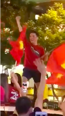 Không đơn thuần chỉ hoà vào đám đông, Mr. Đàm còn là người chủ động hô khẩu hiệu, ra lệnh reo hò chiến thắng của đội tuyển nước nhà. Thậm chí, anh còn leo lên nóc xe ô tô để khuấy động không khí.
