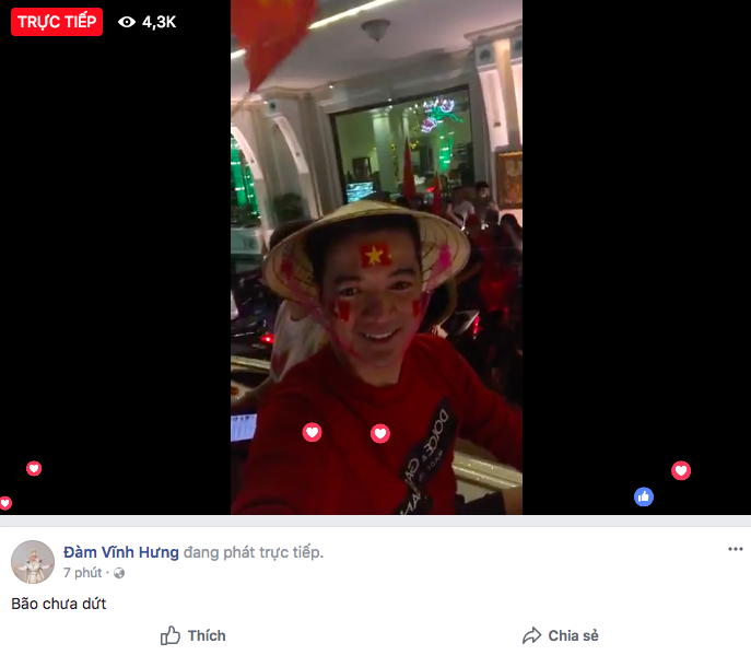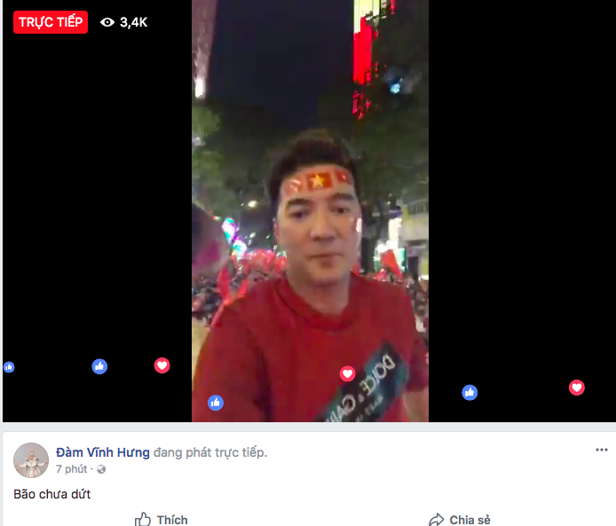 Suốt 120 phút diễn ra trận đấu, người hâm mộ bày tỏ nỗi xúc động, lòng tự hào dân tộc khi liên tục la hét cổ vũ, ăn mừng trước mỗi thời điểm đội tuyển Việt Nam sút tung lưới đối phương. Trong đêm qua, hàng loạt sao Việt xuống đường “đi bão” và Mr. Đàm cũng không ngoại lệ.
