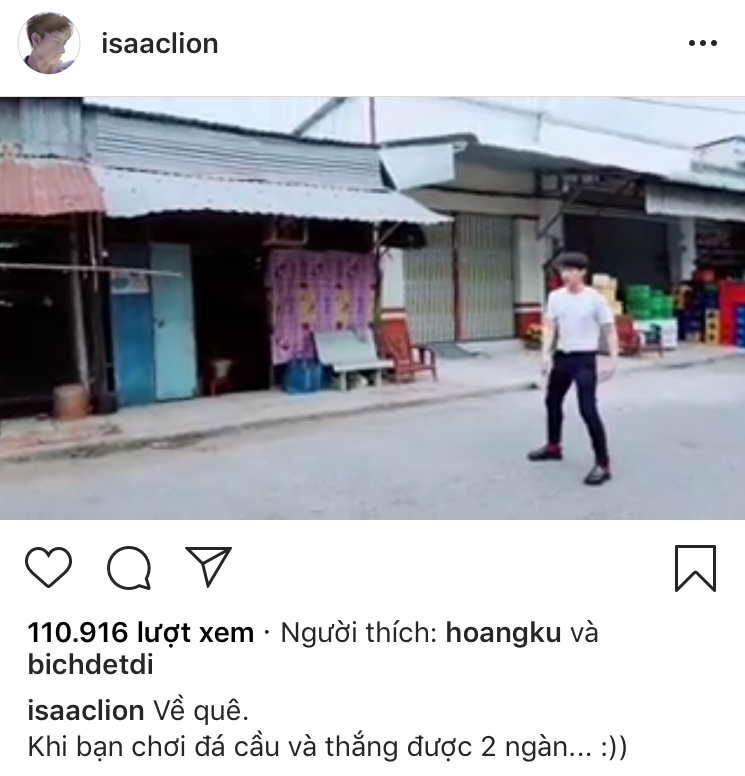 Mới đây, trên trang cá nhân của mình nam ca sĩ Isaac đăng tải một đoạn clip về quê đá cầu, diện trang phục đơn giản anh chàng trông rất hào hứng với trò chơi này. Tuy “mướt mồ hôi” thi đấu nhưng cuối cùng phần thưởng giọng hát Tôi đã quên thật rồi nhận được thật sự “bật ngửa”: 2 nghìn đồng. Tuy “chiến lợi phẩm” chỉ đủ mua kẹo nhưng niềm vui mang lại hẳn nhiên gấp nhiều lần như vậy, chỉ cần nghe giọng cười sảng khoái của Isaac là đủ hiểu!