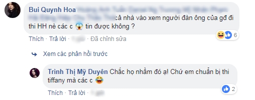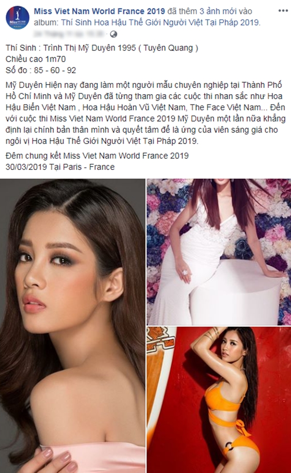 Mới đây trên trang cá nhân của mình Mỹ Duyên bất ngờ chia sẻ thông tin thí sinh của fanpage Miss Viet Nam World France 2019 và không ai khác chính là đích danh cô nàng. Chuẩn bị “chinh chiến” tại một “đấu trường nhan sắc” đẳng cấp quốc tế, học trò của Lan Khuê nhận được nhiều lời chúc mừng của đông đảo bạn bè và người hâm mộ. Bên cạnh đó, phải kể đến Giải Vàng Siêu mẫu 2018 Bùi Quỳnh Hoa với lời kêu gọi “hội chị em” không thể “lầy lội” hơn: “Cả nhà vào xem người đàn ông của gia đình đi thi Hoa hậu nè các chị. Tin được không?“. Mỹ Duyên cũng không vừa khi đáp lời: “Chắc họ nhầm đó ạ! Chứ em chuẩn bị thi Tiffany mà”.
