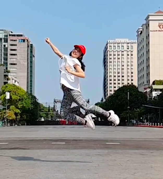 Theo đuổi phong cách quyến rũ, gợi cảm, không mấy bất ngờ khi Hằng Bingboong chọn trang phục thể thao để “lơ lửng” trong bức ảnh đại diện mới của mình. Ở khung hình siêu chậm, người xem có thể quan sát rõ hơn thân hình săn chắc, đặc biệt là các bó cơ khỏe khoắn khi cô nàng bật nhảy giữa phố đi bộ Nguyễn Huệ. Không sử dụng quá nhiều đạo cụ và phụ kiện trong ảnh như những mỹ nhân khác, bù lại việc lồng nhạc nền vui nhộn được tích hợp sẵn trong Galaxy S9 khiến ảnh đại diện “lơ lửng chậm” của Hằng Bingboong ghi điểm nhờ sự gần gũi và sáng tạo hơn hẳn.