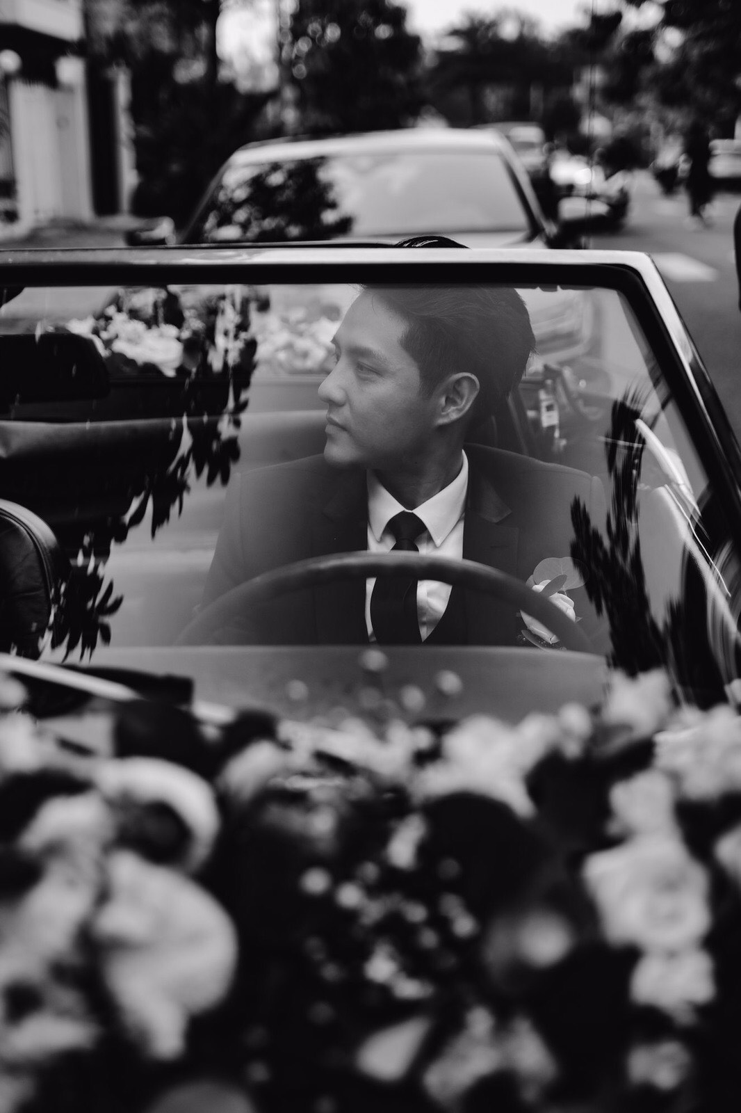 Cô dâu Đông Nhi bẽn lẽn lấp ló bên cửa.