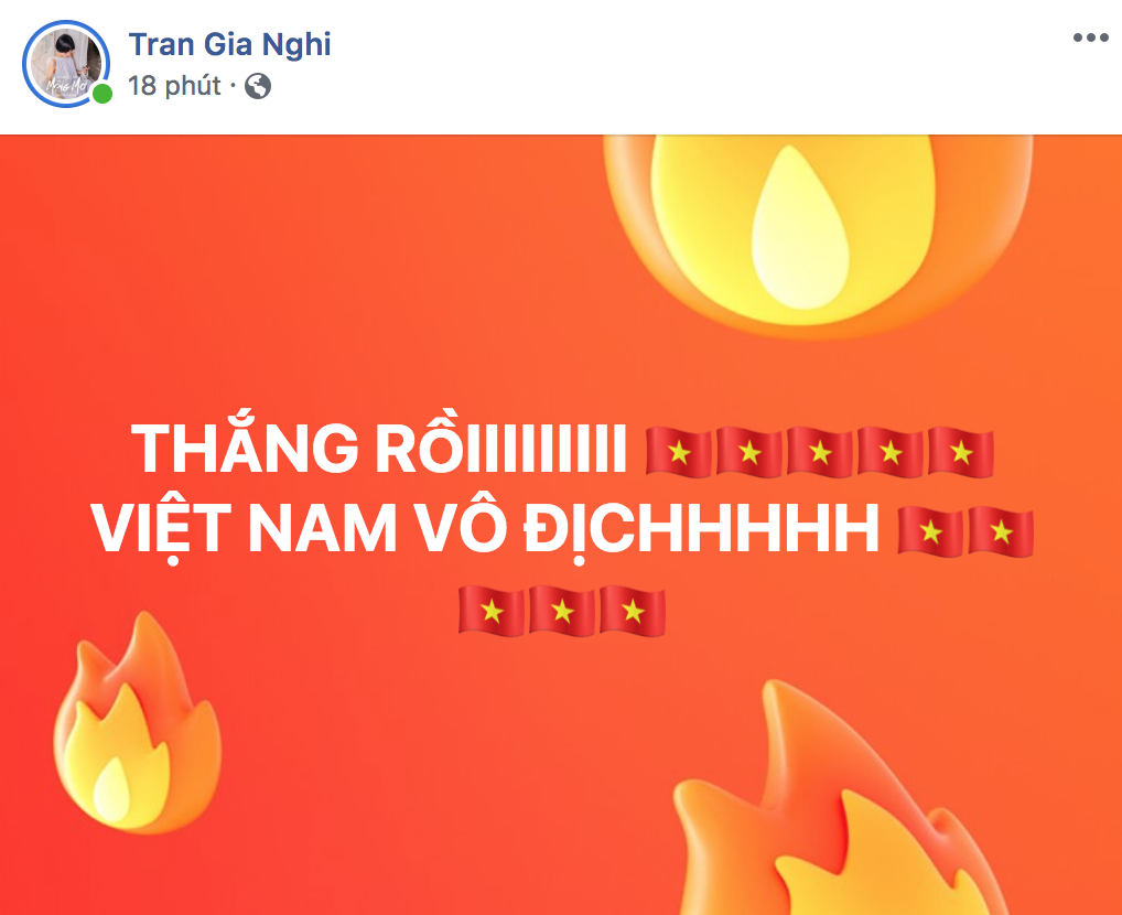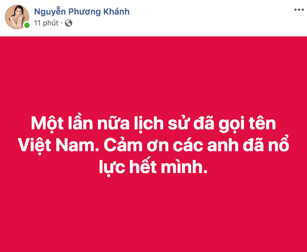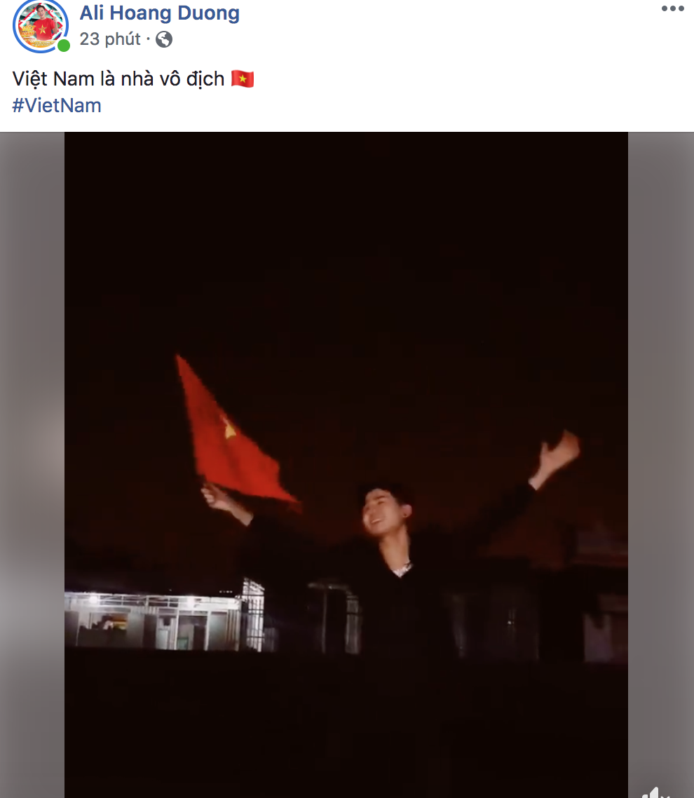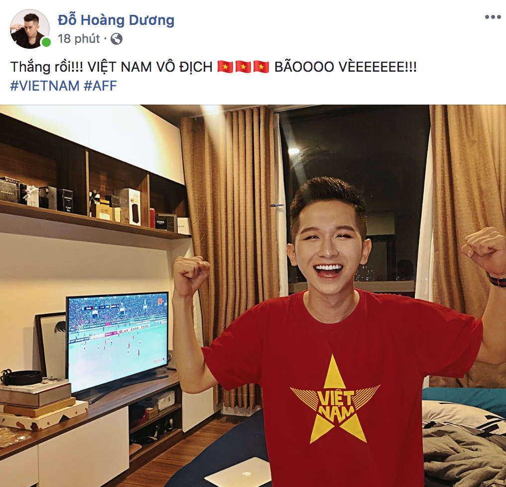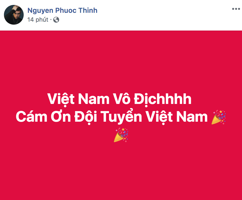 Tối 15/12, đội tuyển Việt Nam chính thức trở thành nhà vô địch của AFF Cup 2018 sau 10 năm chờ đợi. Có thể nói đây là niềm vui vô cùng lớn dành cho cả đất nước, đêm nay chắc chắn sẽ là một đêm khó ngủ của cả dân tộc. Hòa chung không khí ấy, các sao Việt cũng dành lời cám ơn đến các chàng trai vì một mùa giải thi đấu vô cùng xuất sắc cũng như thể hiện sự phấn khởi vì quá tự hào.